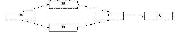 Рис. 1. Сеть типа «вершины-работы» Как видно из сетевого графика, на нем изображена простая модель, или сеть, состоящая из пяти взаимосвязанных работ: А, Б, В, Г и Д. Исходной, или начальной, является работа А, за которой следуют промежуточные работы — Б, В и Г и далее завершающая работа Д.