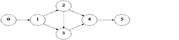 Рис. 2. Сеть типа «вершины-события» На этом сетевом графике отражен простой производственный процесс, включающий шесть взаимосвязанных событий: 0, 1, 2, 3, 4 и 5. Начальным в данном случае является нулевое событие, завершающим — пятое, все остальные — промежуточные. Между каждым из двух событий заключено по одной действительной работе, изображенной в виде сплошной линии- стрелки. События 2 и 3 соединены между собой фиктивной работой, которая означает наличие между ними временной зависимости или логической связи. Событие 3 не может быть завершено до окончания события 2. В практике сетевого планирования на отечественных предприятиях более широкое распространение получили модели типа вершины-события (рис. 2.). Однако в настоящее время на многих американских фирмах стали также применяться сети типа вершины-работы (рис. 1.). Основное их преимущество заключается в следующем. 1. Работа в таких сетевых моделях выглядит более естественной, так как представляет собой схематично рабочее место исполнителя или специалиста. 2. Графическое изображение сетевой модели также представляется более удобным, поскольку имеется возможность нарисовать вначале все работы, а затем расставлять необходимые логические зависимости. 3. Написание прикладных программ для данных сетей тоже является более простым и менее трудоемким видом деятельности. 4. Сетевые графики типа вершины-работы более адаптированы к существующим в управлении проектами стандартам. Во всех сетевых графиках важным показателем служит путь, определяющий последовательность работ или событий, в которой конечный процесс, или результат, одной стадии совпадает с начальным показателем следующей за ней другой фазы. В любом графике принято различать несколько путей: 1. полный путь от исходного до завершающего события; 2. путь, предшествующий данному событию от начального; 3. путь, следующий за данным событием до завершающего; 4. путь между несколькими событиями; 5. критический путь от исходного до конечного события максимальной продолжительности. Сетевые модели могут быть весьма разнообразны как по организационной структуре производственной системы, так и по назначению сетевых графиков, а также используемым нормативным данным и средствам обработки информации. По организационной структуре различают внутрифирменные или отраслевые модели сетевого планирования, по назначению - единичного и постоянного действия. Сетевые модели бывают детерминированные, вероятностные и смешанные. В детерминированных сетевых графиках все работы стратегического проекта, их продолжительность и взаимосвязь, а также требования к ожидаемым результатам являются заранее определенными. В вероятностных моделях многие процессы носят случайный характер. В смешанных сетях одна часть работ является определенной, а другая - неопределенной. Модели могут быть также одноцелевые и многоцелевые. При построении сетевых графиков необходимо учитывать все существующие реальные условия и конкретные характеристики работ на каждом предприятии. Заключение