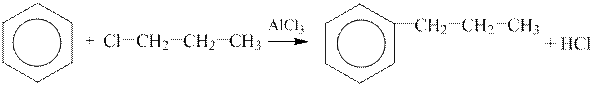 1 етап. Таким чином, у молекулу бензолу необхідно ввести алкільний радикал ― пропіл. Один із методів одержання гомологів бензолу ― синтез Фріделя-Крафтса. Алькільний радикал вводять у кільце за дії на бензол галоїдалкілів за присутності алюміній хлориду.