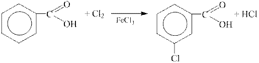 3 етап. За умовою задачі на продукт окиснення необхідно подіяти хлором у присутності ферум(ІІІ) хлориду. Це реакція електрофільного заміщення. У похідних бензолу (за типом С6Н5- х ), які мають замісник, атоми Карбону в кільці нерівноцінні за електронною густиною, тому за уведення іншого замісника можливим стає утворення трьох ізомерів. Місце, куди буде спрямовуватися другий електрофільний замісник, визначатиметься природою замісника, який уже знаходиться в кільці (тобто першого або орієнтуючого замісника). Орієнтуючі замісники в бензольному кільці поділяють на дві групи: орто -– пара - і мета -орієнтанти. Карбоксильна група ― це орієнтант ІІ роду, тому наступний замісник буде направлятися в мета -положення відносно карбоксильної групи: