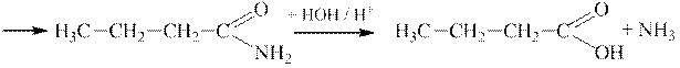 Нітрили кислот, як й інші похідні карбонових кислот, в умовах гідролізу перетворюються на кислоти: 1 етап. З 1-хлорпропану одержують нітрил кислоти, в якому є 4 атоми Карбону, тобто нітрил масляної (бутанової) кислоти: