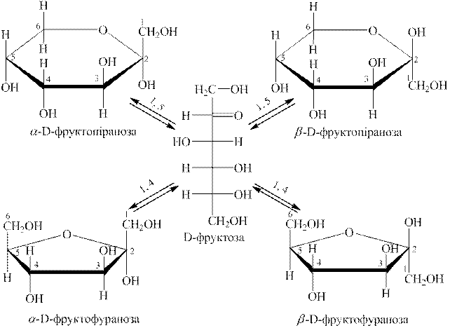 Утворення циклічних форм відбувається за рахунок таких перетворень: атом Гідрогену спиртової гідроксигрупи переходить до карбонільного Оксигену (за місцем розриву подвійного зв’язку), а Оксиген цього гідроксилу зв’язується з другим атомом Карбону. Якщо в перетвореннях бере участь гідроксил біля п’ятого атому Карбону, то утворюється п’ятичленний цикл, а якщо бере участь гідроксил біля шостого атому Карбону ― утворюється шестичленний цикл (тобто відбувається 1, 5- або -1, 4-взаємодія). Другий атом Карбону, який в оксоформі був карбонільним Карбоном, називають напівацетальним атомом Карбону, а зв’язана з ним гідроксигрупа ― напівацетальним або глікозидним гідроксилом. Цей атом Карбону в циклі стає асиметричним атомом і тому кожна напівацетальна форма, як піранозна, так і фуранозна, існують у вигляді двох стереоізомерів з протилежним просторовим розміщенням Гідрогену і гідроксигрупи біля напівацетального Карбону. Форми, в яких гідроксигрупа розміщується з того боку, з якого розташовується гідроксигрупа біля асиметричного атому Карбону, що визначає приналежність моносахариду до D-, L-ряду, відносяться до α -форм, а ті, у яких вона розміщується з протилежного боку, ― до β -форм. Проекційні формули Фішера відображають будову моносахариду тільки умовно. Більш правильним і точним є спосіб відображення формул за Хеуорсом. Циклічні форми розмішують перспективно ― перпендикулярно до площини кільця, згори або знизу розміщують атоми Гідрогену і гідроксигрупи. Таутомерну рівновагу, яка існує в розчині D-фруктози, використовуючи формули Хеуорса, відображують наступною схемою: