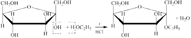 2 етап. Необхідно розрізняти, яка з існуючих у розчині таутомерних форм може вступати в ту або іншу реакцію. Якщо реакція відбувається за карбонільною групою, то реагуватиме розкрита оксоформа (яка має карбонільну групу). У реакціях утворення глікозидів беруть участь гідроксигрупи і, перш за все, найбільш активний напівацетальний гідроксил. Схеми таких реакцій необхідно писати, використовуючи одну з напівацетальних форм. За умовою задачі реакцію слід проводити з α -D-фруктофуранозою. Реакція моносахаридів зі спиртами перебігає за напівацетальним гідроксилом з утворенням глікозиду ― похідного, в якому Гідроген гідроксигрупи заміщений на радикал. Реакція відбувається за умов нагрівання у присутності гідрогенхлориду. Інші гідроксогрупи за цих умов зі спиртами не взаємодіють.