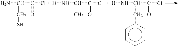 Тема Аміни, амінокислоти, білки Навчальна задача Написати схему утворення трипептиду з галогенангідридів наступних амінокислот: цистеїну, аланіну і фенілаланіну. Яка кольорова реакція вказує на присутність у цьому пептиді ароматичного угруповання? Написати схему цієї реакції. Загальний підхід. Різні амінокислоти під час одержання білків зв’язуються за рахунок карбоксильної й аміногрупи з утворенням угруповання –СО–NН–, яке називається пептидним зв’язком. Продукт взаємодії двох α -амінокислот називається дипептидом, трьох ― трипептидом, багатьох ― поліпептидом. Реакції утворення поліпептидів з α -амінокислот складають основу синтезу білкових сполук у живих організмах. Загальну формулу поліпептиду можна записати наступним чином: