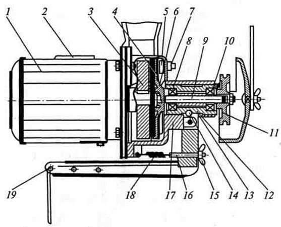 Маховик 3 кріпиться на валу електродвигуна 1, а диск 6 – на валу 9 привода. На диску 6 встановлюються по обидві сторони фрикційні накладки 4 з високим коефіцієнтом тертя. На корпусі 17 привода гайкою 7 кріпиться гальмівна колодка 5. Вал 9 обертається у двох кулькових підшипниках 8 і 10, запресованих у втулку 12. Втулка 12 разом з валом 9 і диском 6 може зміщуватися вздовж корпуса 17 привода. На правому кінці валу 9 на шпонці встановлюється шків 11 привода і кріпиться гайкою. Через овальний отвір 13 в корпусі 17 привода в отвір втулки 12 вставлений палець 14, закріплений у вилці важеля 19. Важіль 19 під дією пружини 18 зміщує втулку 12 з диском 6 від муфти 3. Пружина 18 одним кінцем з’єднана з корпусом 17, а другим – зі шпилькою 16, яка закріплена у важелі 19 гайкою 15. Важіль 19 з’єднаний через тягу з педаллю. Електродвигун підключений через контакти коробки 2 до мережі змінного струму. Електродвигун може підключатися до електричної мережі напругою 220 і 380 В. При підключенні електродвигуна необхідно дотримуватись правил електробезпеки. Цю роботу слід виконувати при відключеному живленні. Електродвигун та металеві частини промислового стола повинні бути заземлені. При заміні електродвигуна на інший звертають увагу перш за все на відповідність потужностей і частоти обертання валу електродвигуна. Робота фрикційного електропривода. При включенні електропривода маховик отримує рух від електродвигуна. При натисканні оператором на педаль важіль 19 (див. рис. 3.2) переміщає вал 9 з диском 6 вліво, і фрикційні накладки 4, які контактують з маховиком, надають обертів від маховика 3 валу 9 і шківу 11. Чим більше зусилля натискання на педаль, тим з більшою силою диск 6 притискається до маховика 3 і більша частота обертання шківа 11 та головного валу машини. При зменшенні силового впливу на педаль важіль 19 під дією пружини 18 повертає диск 6 вправо. Диск, контактуючи через фрикційну накладку з чавунною гальмівною колодкою 5, внаслідок тертя між ними зупиняється і зупиняє обертання валу 9 і шківа 11. Обертання головного валу машини припиняється.