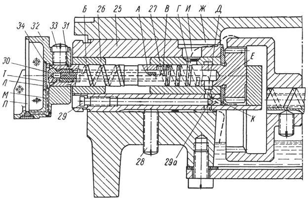 Рис. 5.4. Схема машини 97 класу На конічній торцевій поверхні штуцера міститься невеличкий канал Т, який з’єднує осьовий отвір штуцера з кільцевим пазом Л човника. Кільцевий паз, у свою чергу, вертикальним каналом М, горизонтальним каналом Н з’єднаний з направляючим пазом П, до якого подається масло для мащення поверхонь тертя човника. У виточку Л вкладено невеличке фетрове кільце. Передній кінець виточки закритий заглушкою 34. Ззовні канали М і Н також закриті заглушками для запобігання витіканню масла. Масло в човник подається з картера таким чином (на рис. 5.5 шляхи руху масла показані умовними лініями).