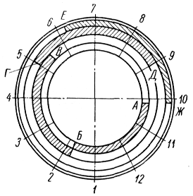 У фронтальній частині рукава машини через трубку з гнітами М1, М2, М3 змащуються деталі механізмів голки і ниткопритягувача. Маслянки М4 і М5 служать для мащення передньої і задньої втулок головного валу машини. Трубки М6 і М7 служать для мащення головки шатуна валу підйому і манжетки з вилкою механізму подачі. Втулки вертикального валу змащуються через трубки М8 і М9. Відсутність автоматичного мащення в машині є деяким її недоліком, який не дозволяє підвищити продуктивність. Моменти, що характеризують взаємодію роботи виконавчих органів машини, вказані на циклограмі (рис. 6.2). У першому кільці від центру зображено роботу голки, у другому – човника, у третьому – ниткопритягувача, в четвертому – рейки. Робочий цикл утворення стібка закінчується за один оберт головного валу. Поділивши коло на 12 рівних частин (кожна поділка відповідає куту повороту головного валу на 30°) і за початкове положение (точка 1) приймаємо нижнє положення голки. Залежно від товщини тканини початок проколу її голкою (точка А) буде після положення 10 пальця кривошипа голки (в межах 275–285° від нижнього положення). Точка Б відповідає початку захвату петлі носиком човника. Розширення петлі і обведення її до положення скидання зі шпулетримача (на 10–15° за вертикаль) продовжується до точки В (близько 135°). Дещо раніше в точці Г (120°) вушко ниткопритягувача, спочатку ще повільно, починає підніматися і знімати верхню нитку зі шпулетримача, закінчуючи свій рух до точки Д (240º). До цього моменту вже відбудеться затягування стібка і змотування такої довжини нитки з котушки, яка була затрачена на утворення стібка. Після цього вушко ниткопритягувача починає подачу верхньої нитки (спочатку повільно).