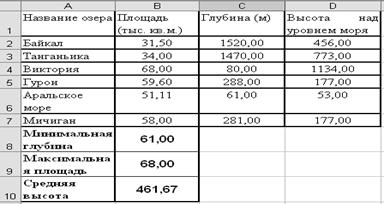 Решение: Для решения задачи воспользуемся статистическим функциями МИН(), МАКС() и СРЗНАЧ(). 1. В клетку с адресом В8 поместим формулу: МИН(С2: С7) — поиск минимального значения по диапазону клеток С2: С7, содержащему значения глубин каждого озера. 2. В клетку с адресом В9 поместим формулу: МАКС(В2: В7) — поиск максимального значения по диапазону клеток В2: В7. 3. В клетку с адресом В10 поместим формулу: CP3HAЧ(D2: D7), с помощью которой вычисляется средняя высота озер над уровнем моря. 4. В клетки A8, A9 и А10 поместим соответствующие пояснения. В результате получим таблицу: