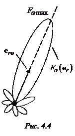 Точка находится в дальней зоне, если удовлетворяются 3 неравенства: , где – наибольший линейный размер системы (излучающей площадки). Как видно из (4.1), поле в дальней зоне представляется в виде произведения двух функций – скалярной , зависящей только от расстояния , и векторной , зависящей от направления из на точку наблюдения . Эта функция называется характеристикой направленности излучающей площадки. Как и всякий вектор, ее можно представить в виде , где орт указывает пространственную ориентацию (поляризацию) вектора . Согласно (4.1), она совпадает с поляризацией вектора . Скалярная характеристика направленности , которая несет информацию об амплитудном распределении поля излучения в зависимости от , может быть записана в виде произведения , где – значение характеристики направленности в направлении максимального излучения (орт на рис. 4.4). Функция называется нормированной характеристикой направленности. Очевидно,