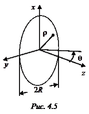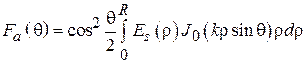 Круглая площадка с центрально-симметричным распределением поля. Допустим, что площадка имеет форму круга (рис. 4.5), а распределение поля центрально-симметричное, т. е. . В таком случае и характеристика направленности осесимметрична, т. е. является функцией одного угла . После соответствующих преобразований интеграла (4.2) выражение для характеристики направленности такого раскрыва можно привести к следующему виду: