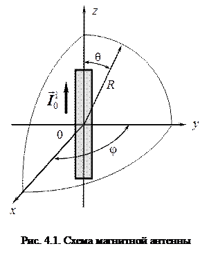 Рассмотрим излучение магнитной антенны. Начало сферической системы координат располагается в середине антенны, при этом полярная ось (ОZ) направлена вдоль ее оси (рис. 4.1). Величина линейного магнитного тока в антенне равна: