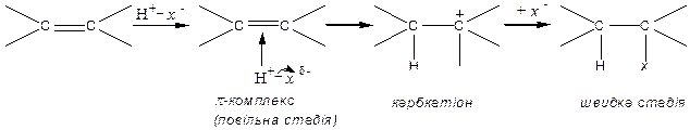 Способи одержання алкенів: дегідратація спиртів; дегідрогалогенування галогенопохідних алканів; дегалогенування віцинальних дигалогенопохідних алканів та ін. Правило Зайцева. 4. Фізичні та хімічні властивості алкенів Закономірності зміни фізичних властивостей в гомологічному ряду і залежно від структури ізомерів. Хімічні властивості алкенів обумовлені наявністю в їх молекулах подвійного зв’язку. Реакції приєднання Оскільки подвійний зв'язок виявляє електронодонорні властивості, алкени переважно вступають у реакції електрофільного приєднання за двостадійним механізмом. Механізм реакції електрофільного приєднання