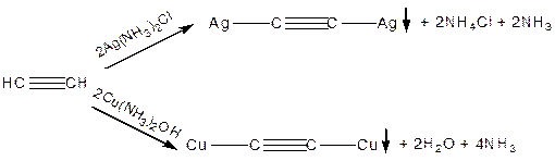 Наведену реакцію використовують як якісну реакцію на потрійний зв’язок. Під дією сильних окисників в молекулі алкінів відбувається розрив карбонового ланцюга за місцем потрійного зв’язку, в результаті чого утворюються карбонові кислоти. На повітрі ацетилен горить кіптявим полум’ям, під дією кисню – сліпучим полум’ям із виділенням великої кількості тепла. Специфічні реакції Для алкінів характерні реакції заміщення, що обумовлено значною поляризацією ≡ С-Н зв’язку. Утворення металевих похідних — ацетиленідів: