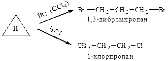 2. Реакції заміщення Реакції заміщення більше характерні для п’яти-, шестичленних і вищих циклів, які подібно алканам вступають до реакції заміщення в основному за радикальним механізмом. 3. Гідрування циклоалканів На прикладі реакції гідрування нижчих моноциклоалканів за однакових умов, крім температури, наочно спостерігається відносна стійкість циклів та їх здатність до реакцій приєднання: