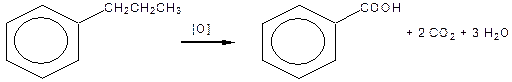 Необхідно відмітити, що ці правила не мають абсолютного значення. У більшості реакцій поряд з переважною кількістю основного продукту реакції (згідно з правилами) утворюються й інші ізомери, в значно меншій кількості. Реакції приєднання: гідрування, фотохімічне хлорування. Окиснення бензолу та його гомологів Бензол дуже стійкий до окисників. За звичайних умов він не знебарвлює розчин калій перманганату В умовах дії окисників на гомологи бензолу окисненню піддається боковий ланцюг, який під час окиснення «згоряє», за виключенням найближчого до ядра атому Карбону, що окиснюється до карбоксильної групи: