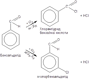 Реакції заміщення в ароматичних альдегідах Для ароматичних альдегідів взаємодія з галогенами відбувається за різними схемами залежноі від умов реакції: