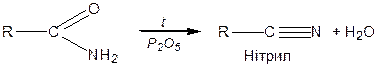 Крім того, аміди можна добувати взаємодією аміаку з ацилуючими засобами (галогенангідридами та ангідридами кислот), а також неповним гідролізом нітрилів. Нагрівання амідів із сильними водовіднімаючими засобами (Р2О5) відбувається з утворенням нітрилів кислот: