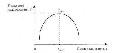 Рис.11.1. Крива Лаффера Тmax — максимальні податкові надходження; tmax — податкова ставка, за якої податкові надходження є максимальними. З подальшим підвищенням ставки мотивація підприємницької діяльності послаблюється, скорочуються обсяги виробництва і зменшуються податкові відрахування. За кривою Лаффера, зниження податкової ставки до оптимального рівня сприятиме економічному зростанню.