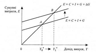 Розгляньмо рівноважну модель товарного ринку з участю держави. За кейнсіанською моделлю, держава провадить фіскальну політику. Зауважимо, що для класичної моделі це є неможливим, оскільки вона ґрунтується виключно на ідеї саморегулювання економіки. Припустімо, держава збирає податки T здійснює витрати на придбання товарів нарівні з домогосподарствами та підприємствами G. Модель має такий вигляд: Y=AD AD=C+I+G C= с0 + c'(Y-T) I=I(r) G=Gconst Y= с0 + c'(Y-T)+I+G Розрізняють дискреційну та недискреційну (автоматичну) фіскальну політику. Дискреційна фіскальна політика — це свідома маніпуляція урядовими витратами і доходами на підставі державних рішень з метою цілеспрямованого впливу на сукупний попит і реальний ВВП. Здійснюється двома шляхами: державними закупівлями (збільшення або зменшення); стягненням чистих податків (через податкові ставки і трансферти) (рис. 11.2). Із зростанням державних закупівель сукупні витрати збільшуються.