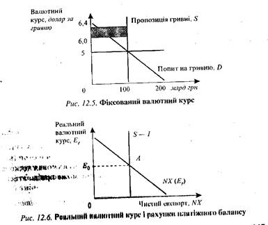 Система фіксованих курсів національної валюти встановлюється Центральним банком країни, який бере на себе зобов'язання купувати і продавати будь-яку кількість іноземної валюти за встановленим курсом. З метою макроекономічної стабілізації Центральний банк країни встановлює межі вільних коливань курсу національної валюти. Якщо ціна валюти наближається до верхньої або нижньої межі, то Центральний банк країни проводить інтервенцію: при наближенні до нижньої межі купує національну валюту в обмін на іноземну, а при наближенні до верхньої — продає національну валюту (рис. 12.5). При плаваючому валютному курсі зниження ціни рівноваги називають знеціненням валюти, підвищення — подорожчанням валюти. За фіксованого валютного курсу зниження ціни називають девальвацією, підвищення — ревальвацією. Реальний валютний курс показує, у якому співвідношенні товари однієї країни обмінюються на товари іншої країни. Реальний валютний курс показує пропорцію обміну вітчизняних товарів на іноземні і розраховується за формулою: Er = En (P / P*) де Er - реальний валютний курс, En - номінальний валютний курс, P - індекс внутрішніх цін, які виражені в національний валюті, P*- індекс цін за кордоном, які виражені в іноземній валюті. Індекси (рівні) цін в обох країнах співвіднесені до одного й того самого базового року. Зростання (спадання) реального валютного курсу свідчить про зниження (підвищення) конкурентоспроможності товарів даної країни на світовому ринку. Реальний валютний курс пов'язаний із динамікою платіжного балансу (рис. 12.6).