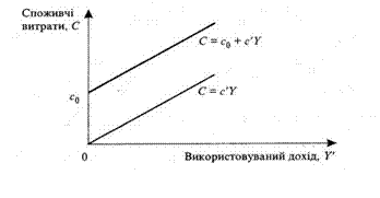 де с0 — автономне споживання, тобто обсяг споживання, який не залежить від використовуваного доходу (за рахунок позик, у борг, за рахунок заощаджень, субсидій). Рис.1 Функція споживання Гранична схильність до споживання (МРС — Marginal propensity to consume), с'— це величина, яка показує, на скільки одиниць зміниться Обсяг споживання при зміні використовуваного доходу на одиницю і визначається за формулою с'= МРС = ∆ С/ ∆ Y, де ∆ С — приріст споживчих витрат, ∆ Y - приріст використовуваного доходу. З геометричної точки зору гранична схильність до споживання — це кут нахилу кривої споживання. Середня схильність до споживання (АРС — Average propensity to consume), — це частка споживання у використовуваному доході: АРС = С/Y. Якби споживчі витрати дорівнювали післяподатковому доходу, то графік функції споживання збігся б із бісектрисою. Перетин лінії 45 градусів і графіка споживання у точці А означає рівень нульового заощадження (рис. 2). Знак " -" означає від'ємне заощадження, оскільки (витрати перевищують доходи, а знак " +" — додатне заощадження, тому що доходи перевищують витрати.