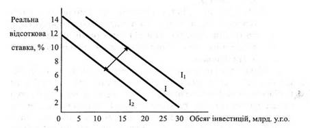 До невідсоткових факторів відносять: 1. Технологічні зміни - технічний прогрес зменшує витрати на виробництво продукції або підвищує її якість, внаслідок чого зростає норма чистого прибутку від інвестування, що викликає зростання інвестиційного попиту за даної відсоткової ставки. Крива інвестиційного попиту переміщується праворуч (І1; рис. 8.3). 2. Рівень забезпеченості основним капіталом - від цього рівня залежить очікувана норма чистого прибутку. Якщо виробничі потужності певної галузі задовольняють попит на її продукцію, то інвестування буде стримуватися, крива інвестиційного попиту переміщується вліво (І2; рис. 8.3) і навпаки. 3. Витрати на придбання, експлуатацію та обслуговування устаткування. Якщо ці витрати скорочуються, то очікувана норма чистого прибутку збільшується, а інвестиційний попит зростає, крива інвестиційного попиту переміщується праворуч (І1; рис. 8.3) і навпаки. 4. Податки на підприємця. Збільшення податків негативно впливає на інвестиції, внаслідок чого крива інвестиційного попиту переміщується вліво (І2; рис. 8.3) і навпаки. 5. Очікування. Якщо економічні умови у країні погіршуються, попит на товар різко скорочується, то фірми утримуються від інвестицій, крива інвестиційного попиту переміщується ліворуч (І2; рис. 8.3) і навпаки. Невідсоткові фактори впливають на інвестиції та переміщують криву попиту на інвестиції (рис. 8.3). Якщо невідсотковий фактор впливає на збільшення інвестицій, тоді крива сукупного попиту на інвестиції І перемінюється вгору (І1). Якщо невідсотковий фактор впливає на збільшення інвестицій, тоді крива сукупного попиту на інвестиції І перемінюється вниз (І2).