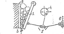 Рис.1. Схема щековой дробилки: 1-подвижная щека; 2 – неподвижная щека; З - разгрузочное отверстие; 4 - привод дробилки; 5-распорные плиты; 6-регулировочнне пластины.