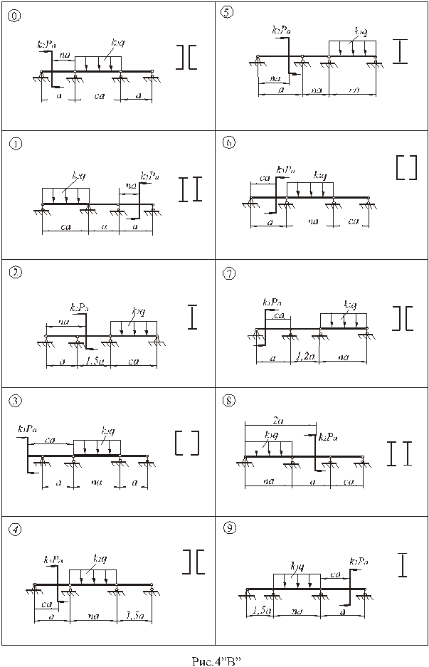 / рис. 4В, табл. 4В / Розкрити статичну невизначенiсть i визначити допустиме навантаження [ P ] або [ q ] для вказаних нерозрiзних балок /див. рис.4В/, представляючих собою розрахункові схеми плоского прямого магістрального трубопроводу. Для спрощення кільцевий переріз трубопроводу замінюємо прокатним профілем, геометричні характеристики якого дані в таблицях сортамента. Розміри са та na заокруглити до двох знаків. Прийняти [ σ ] = 160 МПа. Данi взяти з табл. 4В. Змiст роботи 1. Визначити ступiнь статичної невизначеностi. 2. Вибрати рацiональну основну, а потiм i еквiвалентну системи. 3. Записати систему канонiчних рiвнянь метода сил, що виражають рiвнiсть нулю перемiщень в напрямку вiдкинутих зв`язкiв вiд зовнiшнього навантаження та реакцiй цих зв`язкiв. 4. Визначити вiльний додаток i коефiцiєнти рiвнянь способом Верещагiна, для чого побудувати епюри згинаючих моментiв (Мр; Мi) для основної системи, навантаживши її зовнiшнiми навантаженнями /епюри М р / i одиничними навантаженнями (Хi = 1) в напрямку невiдомих реакцiй вiдкинутих зв`язкiв. При цьому при побудовi всiх епюр (Мр; Мi) визначити опорнi реакцiї. 5. Розв`язати систему рiвнянь i визначити реакцiї вiдкинутих зв`язкiв Хi. 6. Визначити з рiвнянь статики, складених для еквiвалентної статично визначеної системи, решту реакцiй в заданiй системi. 7. Побудувати епюри М i Q для еквiвалентної системи /ординати епюр будуть вираженi через невiдоме зовнішнє навантаження P /. 8. Записати умову мiцностi за нормальними напруженнями для небезпечного перерiзу, де М=Мmax i визначити P. Таблиця 4В
