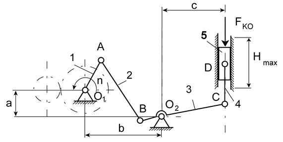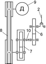 1 – кривошип; 2, 4 – шатун; 3 – коромисло, 5 – повзун; 6 – відкрита зубчаста передача; 7 – редуктор, 8 – пасова передача, 9 – двигун, 10 - муфта.