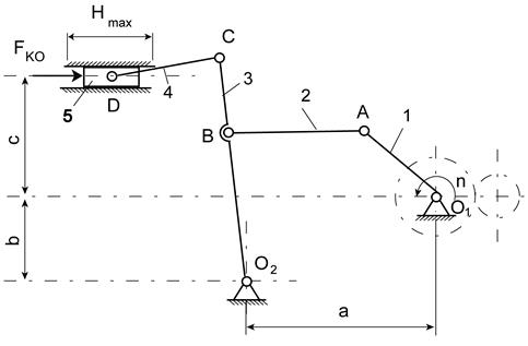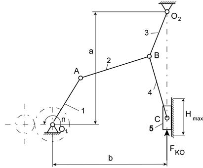 1 – кривошип; 2, 4 – шатун; 3 – коромисло, 5 – повзун; 6 – відкрита зубчаста передача; 7 – редуктор, 8 – пасова передача, 9 – двигун, 10 - муфта.