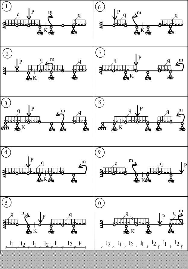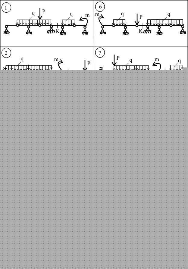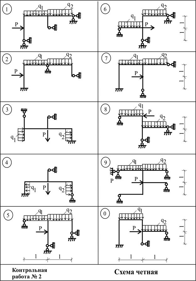 1. Провести кинематический анализ рамы (стр. 16-17), выбранной согласно шифру. 2. Определить степень кинематической неопределимости (число неизвестных метода перемещений) и задать основную систему при учете только изгиба. 3. Записать систему канонических уравнений. 4. Рассмотреть состояния основной системы и, пользуясь таблицей метода перемещений (стр. 18), построить эпюры моментов во всех состояниях. 5. Определить коэффициенты системы канонических уравнений статическим способом. 6. Решить систему канонических уравнений и найти неизвестные перемещения. 7. Построить окончательную эпюру моментов. 8. Построить эпюры поперечных и продольных сил. 9. Выполнить статическую проверку. Примечание. Изгибную жесткость всех элементов рамы принять постоянной.