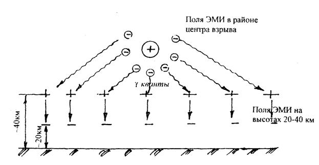 ЭМИ наземного ядерного взрыва характеризуется амплитудой напряженности поля и формой импульса изменения поля с течением времени. Это одиночный однополярный импульс с очень крутым передним фронтом, длительность которого определяется длительностью мгновенного гамма импульса и составляет несколько сотых долей микросекунды, и спадающий подобно импульсу от молниевого разряда по экспоненциальному закону в течение нескольких десятков миллисекунд. Диапазон частот ЭМИ до 100 Мгц, но в основном его энергия распределена около средней частоты (10—15 кгц). Поскольку амплитуда ЭМИ быстро уменьшается с увеличением расстояния, его поражающее действие — несколько километров от центра (эпицентра) взрыва крупного калибра. Так, при наземном взрыве мощностью 1 Мт вертикальная составляющая электрического поля ЭМИ на расстоянии 4 км — 3 кВ/м, на расстоянии 3 км — 6 кВ/м и 2 км — 13 кВ/м. ЭМИ непосредственного действия на человека не оказывает. Приемники энергии ЭМИ — проводящие электрический ток тела: все воздушные и подземные линии связи, линии управления, сигнализации, электропередачи, металлические мачты и опоры, воздушные и подземные антенные устройства, наземные и подземные трубопроводы, металлические крыши и другие конструкции, изготовленные из металла. В момент взрыва в них на доли секунды возникает импульс электрического тока и появляется разность потенциала относительно земли. Под действием этих напряжений может оисходить: пробой изоляции кабелей, повреждение входных элементов аппаратуры, подключенной к антеннам, воздушным и подземным линиям (пробой трансформаторов связи, выход из строя разрядников, предохранителей, порча полупроводниковых приборов и т. д.), а также выгорание плавких вставок, включенных в линии для защиты аппаратуры. Высокие электрические потенциалы относительно земли, возникающие на экранах, жилах кабелей, антенно-фидерных линиях и проводных линиях связи могут представлять опасность для лиц, обслуживающих аппаратуру. Наибольшую опасность ЭМИ представляет для аппаратуры необорудованной специальной защитой, даже если она находится в особо прочных сооружениях, способных выдерживать большие механические нагрузки от действия ударной волны ядерного взрыва. ЭМИ для такой аппаратуры является главным поражающим фактором. Линии электропередач и их оборудование, рассчитанные на напряжение десятков — сотен киловольт, являются устойчивыми к воздействию электромагнитного импульса. Необходимо также учитывать одновременность воздействия импульса мгновенного амма-излучения и ЭМИ: под действием первого — увеличивается проводимость материалов, а под действием второго — наводятся дополнительные электрические токи. Кроме того, следует учитывать их одновременное воздействие на все системы, находящиеся в районе взрыва. На кабельных и воздушных линиях, попавших в зону мощных импульсов электромагнитного излучения, возникают (наводятся) высокие электрические напряжения. Наведенное напряжение может вызывать повреждения входных цепей аппаратуры на довольно удаленных участках этих линий. В зависимости от характера воздействия ЭМИ на линии связи и подключенную к ним аппаратуру могут быть рекомендованы следующие способы защиты: применение двухпроводных симметричных линий связи, хорошо изолированных между собой 