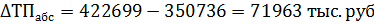 Стоимость всего производства продукции в отчетном периоде составила 422 699 тыс.руб. Наблюдается увеличение на 71 963 тыс.руб или на 20, 52%. Произошло увеличение стоимости как по продукции А, так и по продукции С, на 64 187 тыс.руб (20, 95%) и 746 тыс.руб (52, 57%) соответственно. Стоимость продукции В снизилась на 0, 07%, т.е. 13 тыс.руб и составила в отчетном периоде 17 399 тыс.руб. Стоимость продукции переработки также увеличилась на 63, 71 %, это наибольшее увеличение, и составила 30 339 тыс.руб. В отчетном периоде произошло незначительное изменение структуры. Набольшее изменение произошло по продукции вида В. Ее удельный вес снизился до 41%. Снижение составило 9%. Наименьшее изменение произошло по продукции вида А и С, их удельный вес не изменился или увеличился всего на один процент. Абсолютное отклонение товарной продукции определяется по следующей формуле:
