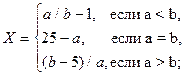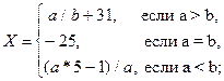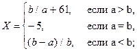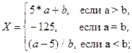 Задача № 2. Вычислить Х для целочисленных данных a и b. Постановка задачи Решение данной задачи предполагает использование алгоритмической структуры ветвления. Для нахождения значения X необходимо проанализировать значения переменных a и b с помощью команды ветвления. В зависимости от того, как эти данные соотносятся – X подсчитывается по той или иной формуле. Входные данные. Неизвестные переменные в выражении – a, b (дробный тип). Выходные данные. Результат вычисления значения выражения – X (дробный тип). Алгоритм. · Ввести входные данные. · Проанализировать входные данные: если a> b тогда // это вариант 1 x= sqr(a)*b+1 иначе // это не вариант 1 если a< b тогда // это вариант 2 x=(a-5)/12 иначе // это вариант 3 x= a/8; · Вывести результат на печать.