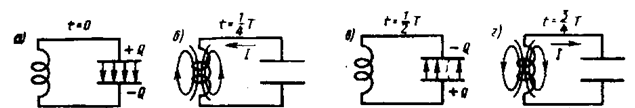 Рис. 18 Для возбуждения в контуре колебаний предварительно заряжают конденсатор, сообщая его обкладкам заряд ±q. Тогда в начальный момент времени t= 0 (рис. 18, а) между обкладками конденсатора возникнет электрическое поле. Если замкнуть конденсатор на катушку индуктивности, конденсатор начнет разряжаться, и в контуре потечет возрастающий со временем ток I. Когда конденсатор полностью разрядится, энергия электрического поля конденсатора полностью перейдет в энергию магнитного поля катушки (рис. 18, б). Начиная с этого момента ток в контуре будет убывать, и, следовательно, начнет ослабевать магнитное поле катушки, тогда в ней согласно закону Фарадея индуцируется ток, который течет в соответствии с правилом Ленца в том же направлении, что и ток разрядки конденсатора. Конденсатор начнет перезаряжаться, возникнет электрическое поле, стремящееся ослабить ток, который, в конце концов, обратится в нуль, а заряд на обкладках конденсатора достигнет максимума (рис. 18, в). Далее те же процессы начнут протекать в обратном направлении (рис. 18, г), и система к моменту времени t=Т (Т – период колебаний) придет в первоначальное состояние (рис. 18, а). После этого начнется повторение рассмотренного цикла разрядки и зарядки конденсатора, то есть начнутся периодические незатухающие колебания величины заряда q на обкладках конденсатора, напряжения UC на конденсаторе и силы тока I, текущего через катушку индуктивности. Согласно закону Фарадея напряжение UC на конденсаторе определяется скоростью изменения силы тока в катушке индуктивности идеального контура, то есть: