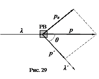 Полученные выражения связывают корпускулярные характеристики фотона – массу, импульс и энергию – с волновой характеристикой света – его частотой n (или его длиной волны l). Корпускулярные свойства света проявляются в эффекте Комптона. Эффектом Комптона называется увеличение длины волны коротковолнового электромагнитного излучения при его упругом рассеянии на свободных электронах вещества. Опыты Комптона показали, что разность длин волн рассеянного (l') и падающего (l) электромагнитного излучения, то есть величина Dl=l'–l не зависит от длины волны l падающего излучения и природы рассеивающего вещества (РВ), а определяется только углом рассеяния q, то есть углом между направлениями лучей до и после рассеяния (рис. 29):