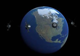 Зверніть увагу, що супутники розташовуються не на лінії горизонту, а на дузі над горизонтом, яка починається на сході і закінчується на заході, залежно від місця прийому. Тепер відійдемо від комп'ютерного моделювання і поглянемо, як це виглядатиме насправді. Виглянемо у вікно. Дивний вигляд, але жодних супутників не видно. Але ви вже знаєте, що вони є. Представимо, ніби то ми здатні бачити далеко-далеко.