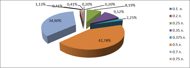 Как видно из приведенного рисунка традиционные для коньяка бутылки емкостью 0, 5 и 0, 7 дм3 составляют более 75% торгового ассортимента товаров, выраженного через покупки коньяка в розницу. Вместе с тем, около 25% приобретаемых в розницу бутылок с коньяком имеют большую (около 4%) или меньшую (около 20%) емкость. Таким образом, можно сделать замечание о том, что существенная доля коньяков французского происхождения в торговом ассортименте бренди на потребительском рынке России обусловлено тем обстоятельством, что для обеспечения экономической доступности этих напитков для российских потребителей французские товаропроизводители разливают свои коньяки в упаковки меньшей емкости (в основном, 0, 25-0, 35 л). Для полноты освещения данного аспекта целесообразно рассмотреть структуру торгового ассортимента коньяка на потребительском рынке России через показатели доли упаковок различной емкости в товарообороте, исчисленном в денежном выражении и численности товарных артикулов. Эти сведения приведены на рисунке 7 [17, c.36].