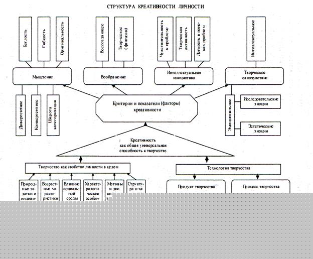 Основными компонентами креативности являются: 1) критерии и показатели, или факторы креативности; 2) творчество как свойство личности в целом; 3) технология творчества. Каждый из этих трех компонентов-блоков в свою очередь включает отдельные элементы, а каждый элемент определяется сочетанием признаков его составляющих. Все компоненты этой системы находятся в сложном взаимодействии.