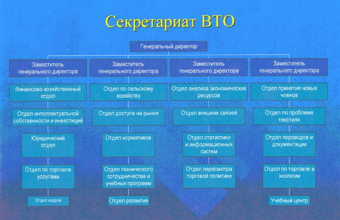 Секретариат и бюджет ВТО Секретариат ВТО находится в Женеве. В нем работает около 500 человек. Во главе организации стоит Генеральный директор. В настоящее время это Паскаль Лами. В обязанности Секретариата входит обслуживание органов ВТО, которые отвечают за проведение переговоров и реализацию соглашений. Особо следует отметить обязанность Секретариата по оказанию технической помощи развивающимся, прежде всего наименее развитым странам. Сотрудники секретариата ВТО готовят аналитические обзоры о состоянии торговли и торговой политики, оказывают помощь в разрешении торговых споров. Другие функции Секретариата включают оказание помощи в проведении переговоров о присоединении к Организации новых членов и консультирование правительств по вопросам членства. Официальными языками ВТО являются английский, французский и испанский. Бюджет ВТО составляет примерно 130 миллионов швейцарских франков. Взносы членов рассчитываются, исходя из их доли в мировой торговле. Часть бюджета ВТО идет на содержание Центра международной торговли (см. ниже).
