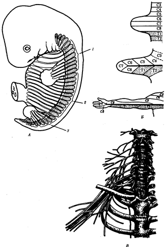 Рис. 14.15. Формирование передних конечностей, их гетеротопия и иннервация в онтогенезе человека. А —врастание шейных миотомов в формирующуюся переднею конечность зародыша; Б —развитие кожной иннервации руки; В — расположение шейного и плечевого сплетений, участвующих в иннервации руки: 1 —шейные миотомы, 2— грудные миотомы, 3 —поясничные миотомы; буквами С, Т, L обозначены шейные, грудные и поясничные сегменты