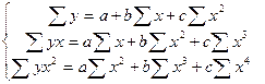 Расчеты производятся в табличной форме, в которой подсчитываются значения å х, å y, å x2, å xy. После нахождения параметров а и b записывается параметризованное уравнение прямой линии. Но линейная форма не всегда отражает сущность явления, хотя предпочтительна, поскольку легко поддается интерпретации. Поэтому при выборе формы связи обязательно рассматриваются и криволинейные зависимости: параболическая гиперболическая смешенная показательная полулогарифмическая и другие. Параметры уравнения также находятся на основе метода наименьших квадратов. Так, для параболы решается следующая система уравнений: