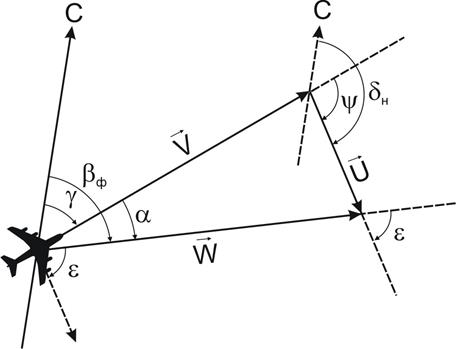 Рис. 3.3. Навигационный треугольник скоростей На рисунке (см. рис. 3.3) НТС дан в той конфигурации, в которой его обычно изображают для ознакомления с его элементами. Элементами НТС называют его стороны, углы между ними, а также углы, которые характеризуют направление сторон треугольника (векторов скоростей) относительно меридиана. На рисунке изображены многие элементы, которые уже рассматривались ранее: - курс γ – угол между северным направлением меридиана и направлением вектора V (как уже упоминалось, его принято считать у самолетов направленным по продольной оси ВС); - фактический путевой угол β Ф – угол между северным направлением меридиана и направлением вектора W; - навигационное направление ветра δ н – угол между северным направлением меридиана и направлением вектора U. Конечно, элементами НТС являются и модули всех трех скоростей. Но, кроме этих элементов, появляются и новые, характеризующие углы между векторами. Одним из таких элементом, самым важным для понимания влияния ветра на полет ВС, является угол ветра. Угол ветра (УВ, ε) – угол, заключенный между направлениями вектора путевой скорости W и вектора ветра U. Его принято отсчитывать от вектора W по часовой стрелке от 0˚ до 360˚. Однако на практике при решении некоторых навигационных задач его удобнее считать изменяющимся от 0˚ до ±180˚. Необходимо обратить внимание, что УВ измеряется именно между направлениями, куда направлены векторы W и U (на рисунке эти направления показаны пунктиром). Поэтому неправильно было бы показать УВ как внутренний угол треугольника, расположенный между этими же векторами: ведь тогда это будет это угол между направлениями, противоположными направлениям W и U. В данной конфигурации НТС этот угол, конечно, численно равен УВ, но в других конфигурациях это может оказаться не так. Не следует путать направление ветра δ н и угол ветра ε. В то время как δ н характеризует, куда дует ветер относительно меридиана (на север, восток и т.д.), угол ветра показывает, куда дует ветер относительно направления полета (вправо, влево, вперед, назад и т.д.). Курсовой угол ветра (КУВ, ψ) – угол, заключенный между направлениями вектора истинной скорости V и вектора ветра U. Отсчитывается аналогично углу ветра: от направления, куда направлен вектор V, до направления вектора U по часовой стрелке от 0˚ до 360˚ (иногда от 0˚ до ±180˚). Название этого элемента (курсовой угол) подсказывает, от какого направления он измеряется: ведь вектор V направлен по продольной оси самолета, то есть по линии курса. Полезно запомнить, что, если измерять УВ и КУВ в диапазоне от 0˚ до ±180˚, то они всегда имеют одинаковый знак, да и по абсолютной величине отличаются друг от друга незначительно – на величину угла сноса. Угол сноса (УС, α) – угол, заключенный между направлениями вектора истинной V и путевой W скоростей. Отсчитывается УС от направления вектора V, которое в свою очередь совпадает с направлением продольной оси ВС. В отличие от УВ и КУВ он всегда измеряется в диапазоне от 0˚ до ±180˚: вправо (по часовой стрелке) с плюсом, влево (против часовой стрелки) с минусом. По-английски угол сноса – drift angle или кратко просто drift (снос). Название этого элемента отражает его физический смысл. Продольная ось самолета направлена в одну сторону (в направлении вектора V), но летит ВС относительно земной поверхности несколько в друг