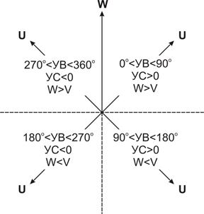 Рис. 3.9. Графики зависимости УС и W от угла ветра На рис. 3.10 изображен вектор путевой скорости W и четыре положения вектора ветра U. Угол между ними, отсчитываемый от W по часовой стрелке, это угол ветра. Из изложенного можно сделать вывод, что УС положителен (сносит вправо) при 0°< УВ< 180° (ветер дует вправо), и наоборот, УС отрицателен (сносит влево) при 180°< УВ< 360° (ветер дует влево). Путевая скорость больше истинной (W> V) когда ветер дует вперед (270°< УВ< 90°), и меньше истинной при 90°< УВ< 270°. Для летной практики важно хорошо представлять себе, при каких УВ снос положительный или отрицательный и когда путевая скорость больше или меньше истинной.