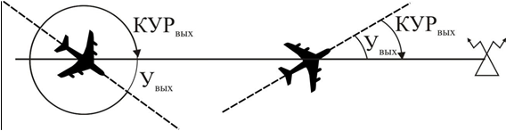 Рис. 3.20 Курсовой угол выхода при полете от РНТ Таким образом, при полете от РНТ КУРвых=180±Увых. И в этом случае выбирать знак в данной формуле целесообразно опираясь на пространственное представление. Достаточно представить: в момент пересечения ЛЗП РНТ находится сзади справа или сзади слева? Тогда, если вы знаете, что такое вообще КУР и в какую сторону он отсчитывается, легко определить КУРвых. Очевидно, что чем больше Увых, тем быстрее ВС выйдет на ЛЗП. Но при выборе Увых пилот должен учитывать следующее. 1. Самолет не может развернуться мгновенно. Пока ВС еще только разворачивается, чтобы взять курс МКвых, оно уже приближается к ЛЗП. И может оказаться, что при большом Увых сразу после взятия курса МКвых уже пора разворачиваться в противоположную сторону на расчетный курс следования по ЛЗП. Но и этот разворот требует времени и самолет все еще будет приближаться к ЛЗП. Может оказаться, что ВС «проскочит» ЛЗП, окажется от нее с противоположной стороны и снова потребуется исправление пути. Поэтому выбираемая величина Увых должна зависеть от величины ЛБУ. При небольших ЛБУ большой Увых недопустим. 2. При выходе на ЛЗП продольная ось ВС направлена к ней под Увых. Но это не значит, что ЛФП пересекает ЛЗП по таким же углом. Ведь самолет не летит в направлении продольной оси из-за наличия угла сноса. Допустим, ЗМПУ=100 и ВС выходит на ЛЗП с правой стороны с Увых=20. Пилот выдерживает МКвых=100-20=80 (в этом направлении направлена продольная ось). Но если ветер дует вправо и создает УС=+10, то ФМПУ=МК+УС=80+(+10)=90. То есть ФМПУ отличается от ЗМПУ всего на 10º. Самолет выходит на ЛЗП под углом 10º, а не 20º, то есть вдвое медленнее, чем ожидал пилот. И наоборот, если бы был УС=-10, то фактически ВС приближалось бы к ЛЗП быстрее (под углом 30º). Таким образом, при выборе Увых пилот должен также учитывать, мешает или помогает ветер выйти на ЛЗП. Ведь если мешает, то ВС может и не успеть выйти на ЛЗП до конца участка. а если при этом УС больше Увых, то ВС вообще не выйдет на ЛЗП, а будет удаляться от нее!