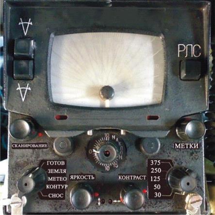 Рис.9.2. Органы управления и индикации БРЛС «Гроза-26». Слева внизу – переключатель режимов работы БРЛС, о которых речь будет идти далее. Посередине прямо под экраном располагается кремальера изменения угла наклона антенны относительно горизонтальной плоскости. Антенну (и, соответственно, направление ее излучения) можно установить так, чтобы она сканировала строго в горизонтальной плоскости (вправо-влево) или наклонить плоскость ее сканирования на несколько градусов вверх или вниз. Нужно помнить, что нулевое положение антенны соответствует истинной горизонтальной плоскости, а не горизонтальной плоскости самолета. Если самолет летит с тангажом или креном, антенна не наклонится вместе с ним, а останется горизонтальной относительно земли. Для этого в БРЛС подаются сигналы от соответствующего внешнего устройства (например, от центральной гировертикали). Масштабы и интервалы между метками Таблица 9.1
