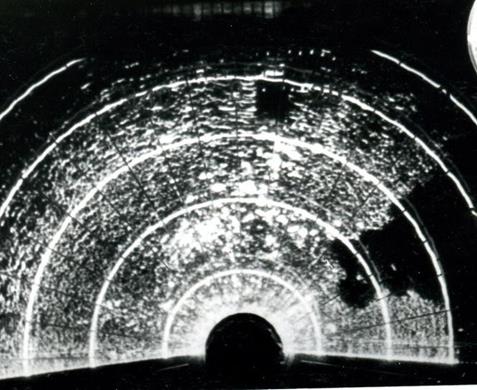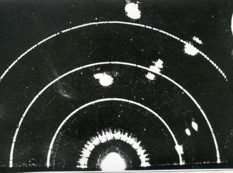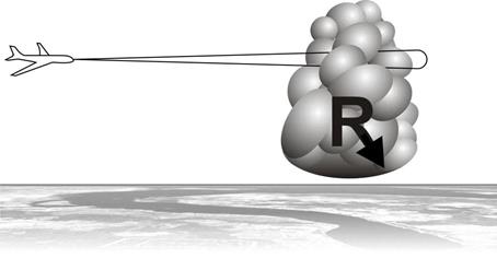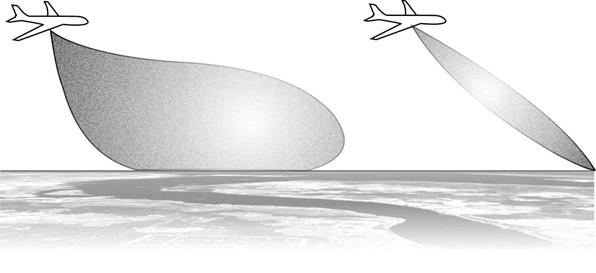 Рис. 9.3. Широкая и узкая диаграммы направленности Как уже отмечалось, удаление отметки объекта на экране от начала развертки соответствует наклонной дальности объекта. Первое, от чего отразится излучаемый электромагнитный импульс – это точка на земной поверхности под ВС. Наклонная дальность от этой точки равна истинной высоте полета, поэтому изображение этой точки появится на соответствующем удалении от начала развертки, то есть не в центре экрана, а на расстоянии, соответствующем высоте. Но антенна сканирует, поэтому изображение этой одной и той же точки появится по всем направлениям излучения. Таким образом, место самолета, которое является точкой, изобразится на экране в виде окружности с радиусом, равным высоте полета! Внутри этой окружности экран будет темным (нет отражающих объектов). В принципе по радиусу высотного кольца можно судить о высоте полета, но точность будет очень низка (порядка 1 км). Из этого ясно, что на экране БРЛС изображение земной поверхности искажено по сравнению с тем, как оно выглядит на карте. Ведь точка превратилась в линию – окружность. Разумеется, будет искажена форма и других объектов поблизости от ВС. Но на больших удалениях, где наклонная дальность практически совпадает с горизонтальной, искажения будут все меньше и меньше (рис. 9.4). На масштабе 375 км введена задержка развёртки, соответствующая дальности 200 км. Это означает, что в момент излучения импульса развертка сразу не начинается, а начнется лишь в момент, когда пройдет время, соответствующее дальности 200 км. Объект, находящийся на этом удалении, изобразится в центре экрана (в начале развертки). Причем все объекты на этом удалении, находящиеся в разные стороны от ВС, изобразятся в этой же точке. Здесь уже окружность с радиусом 200 км стянется в одну точку. Понятно, что и в этом случае будут искажения формы объектов. Задержка введена для того, чтобы лучше рассмотреть именно удаленные объекты, пусть даже с искажениями. На экране на масштабе 375 км будут видны только объекты, находящиеся на удалениях от 200 до 375 км. Режим «Метео». Предназначен для обнаружения зон грозовой деятельности. Используется узкая диаграмма направленности, и устанавливается наклон антенны равный нулю. Антенна сканирует в горизонтальной плоскости на уровне высоты полета и луч пересекает очаги грозовой деятельности (рис. 9.5). Они сильно электризованы, хорошо отражают радиоволны и видны в виде ярких засветок. Чем ярче засветка, тем сильнее гроза (рис. 9.6).
