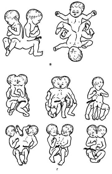 Рис. 12.4. Типы сросшихся близнецов, а — торакопаги; б — краниопаги.