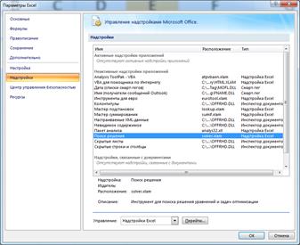 После её активации, в появившемся окне выбираем пункт Надстройки/Поиск решения и нажимаем кнопку Перейти (рис. 4).