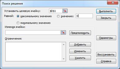 Ячейку, содержащую значение целевой функции советуем сделать активной (хотя это необязательно). В нашем случае это ячейка D1. На вкладке Данные в разделе Анализ выбираем Поиск решений (рис. 9):